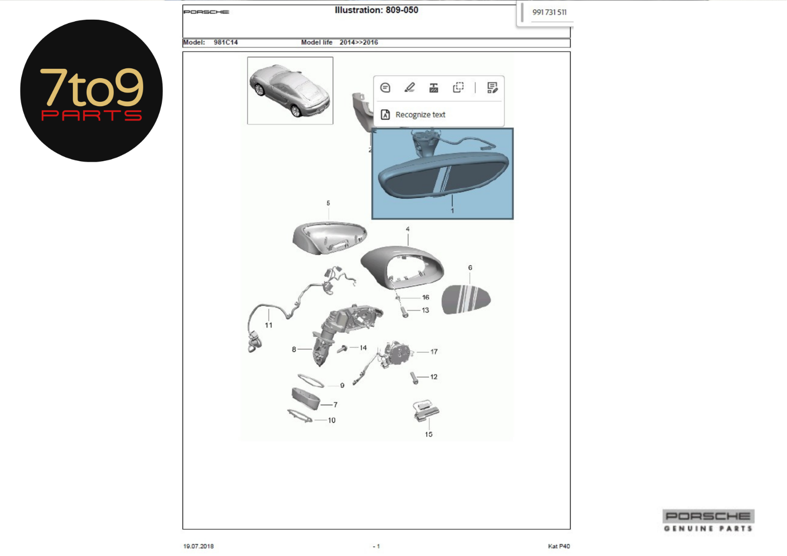 | Porsche Cayman S 981 2015 Interior Rear View Vision Mirror - 991.731.511 |