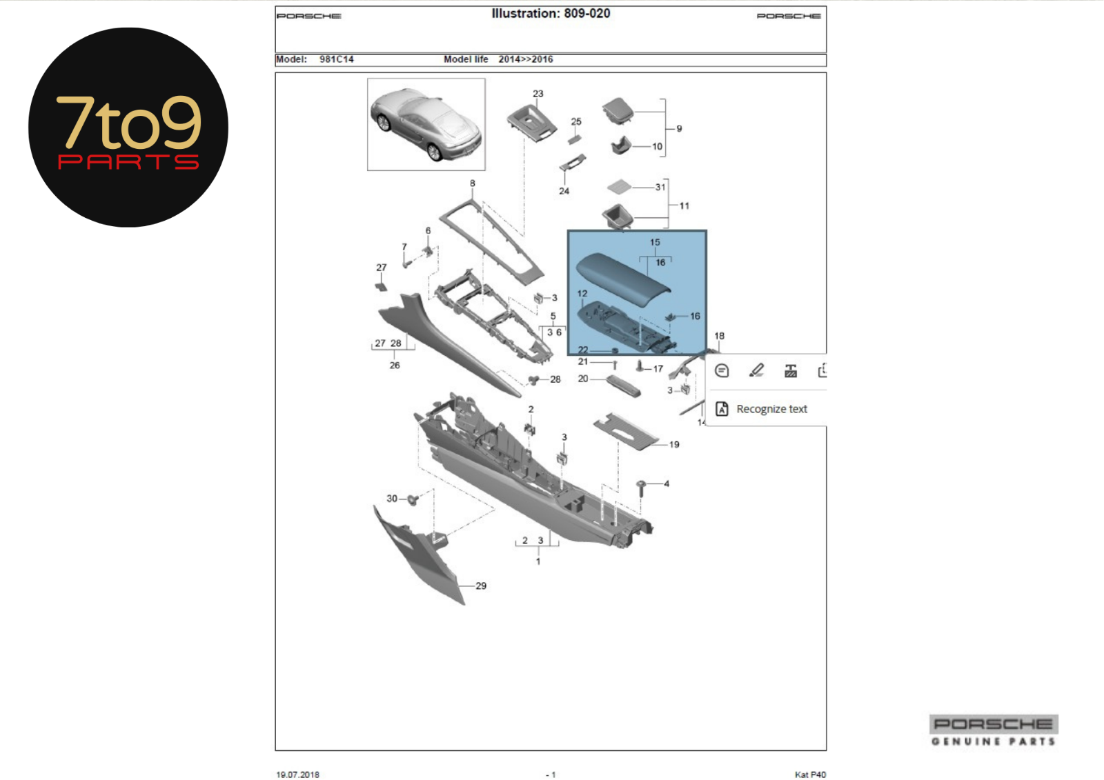 Porsche Cayman S 981 2015 Black Center Console Arm Rest Cover - 991 553 231 00 A11